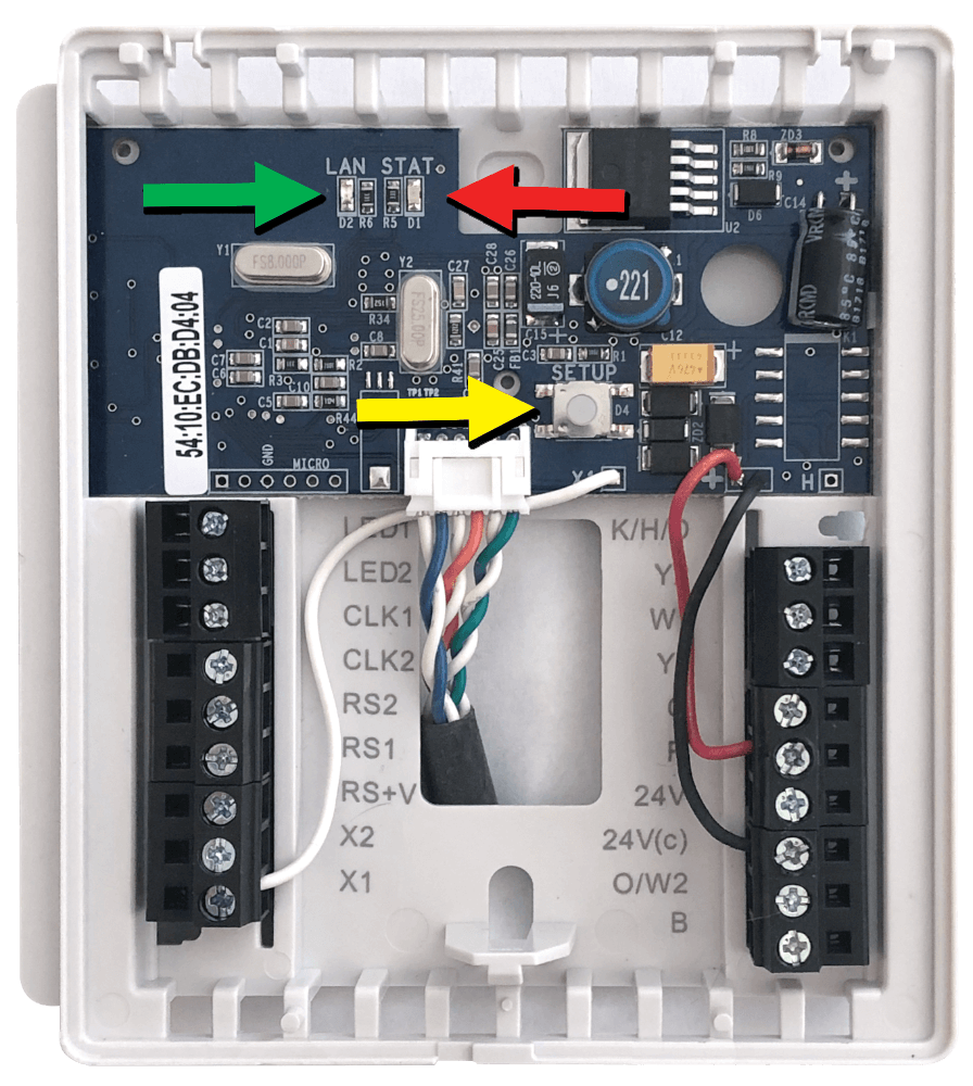 Press and hold the SETUP button (yellow arrow) for 10 seconds. When both the Green LAN LED (green arrow) and Red STAT LED (red arrow) flash together, release the SETUP button, and the IP Backplate will remove the network settings and reboot. Follow the instructions in STEP 3 through STEP 4 above to configure your IP Backplate.